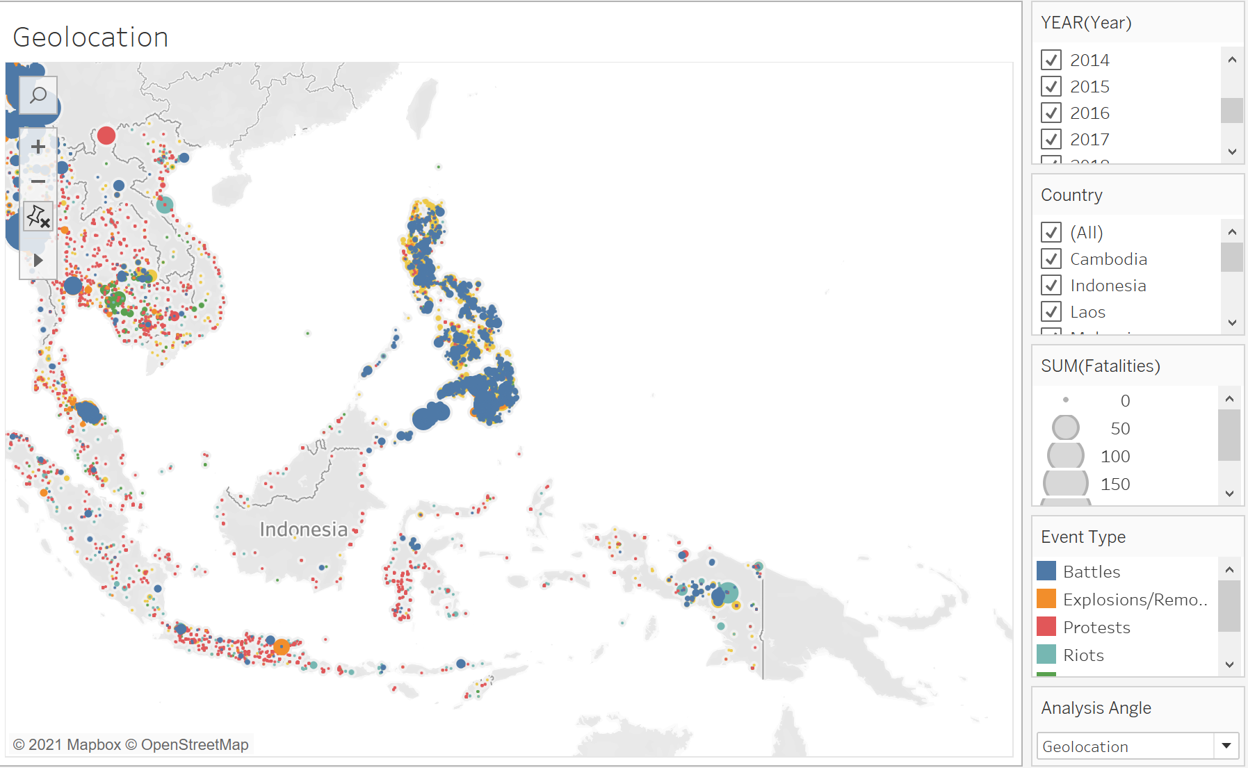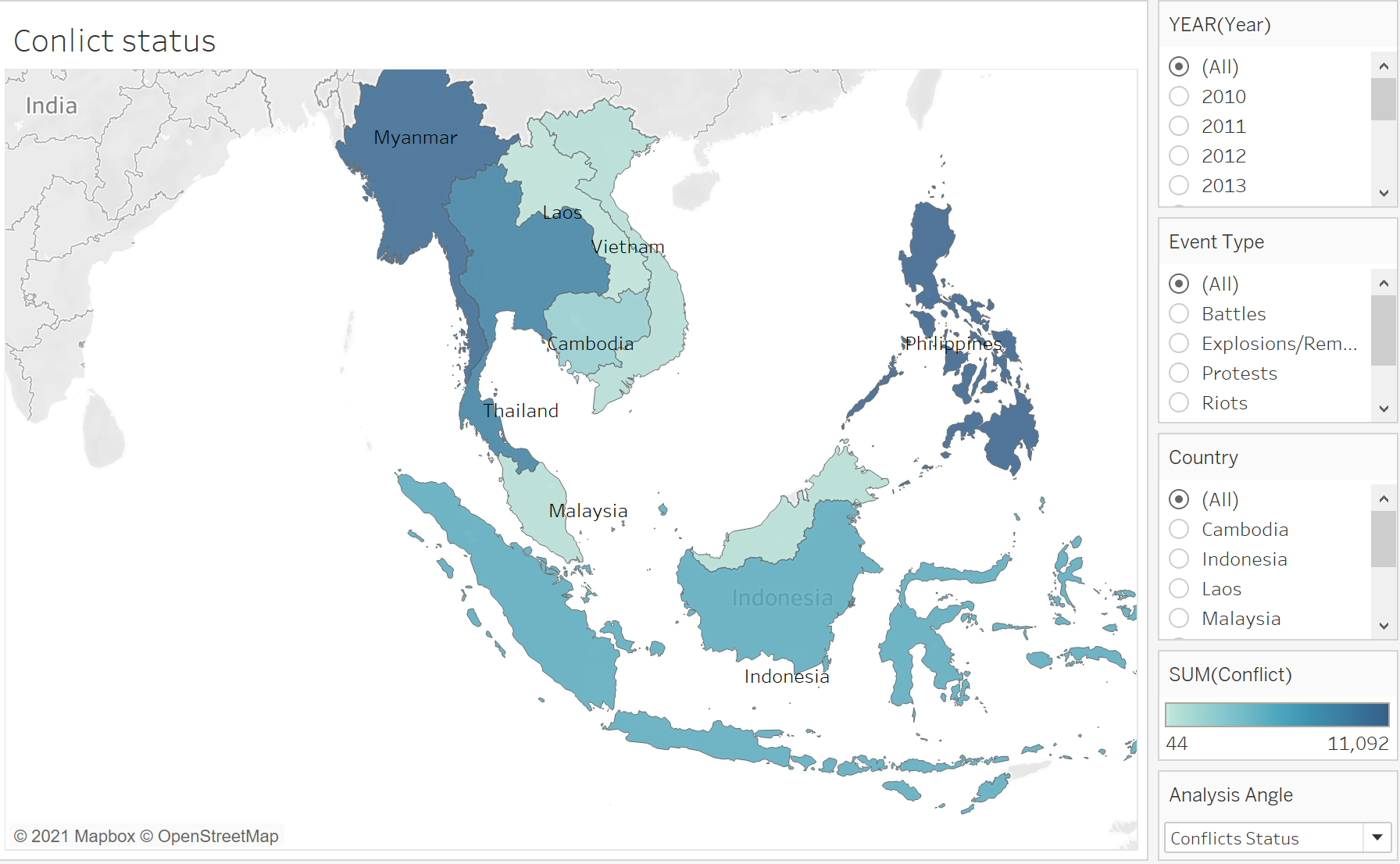 Southeast Asia is often prone to conflict due to its relatively backward economic status and large number of small countries. This post mainly analyzes the frequency, region and type of conflict in Southeast Asia in recent years through the distribution map of conflict occurrence.