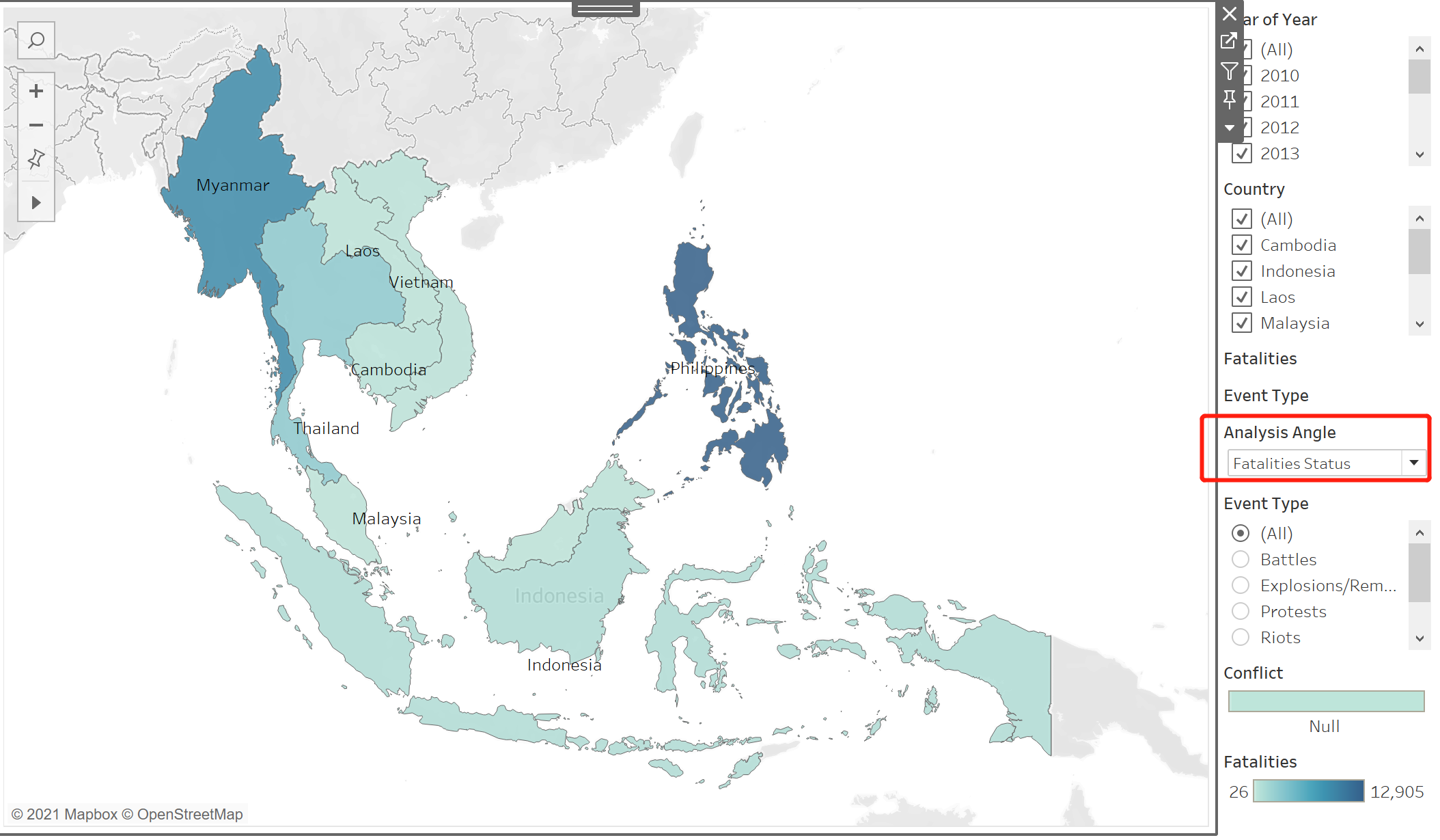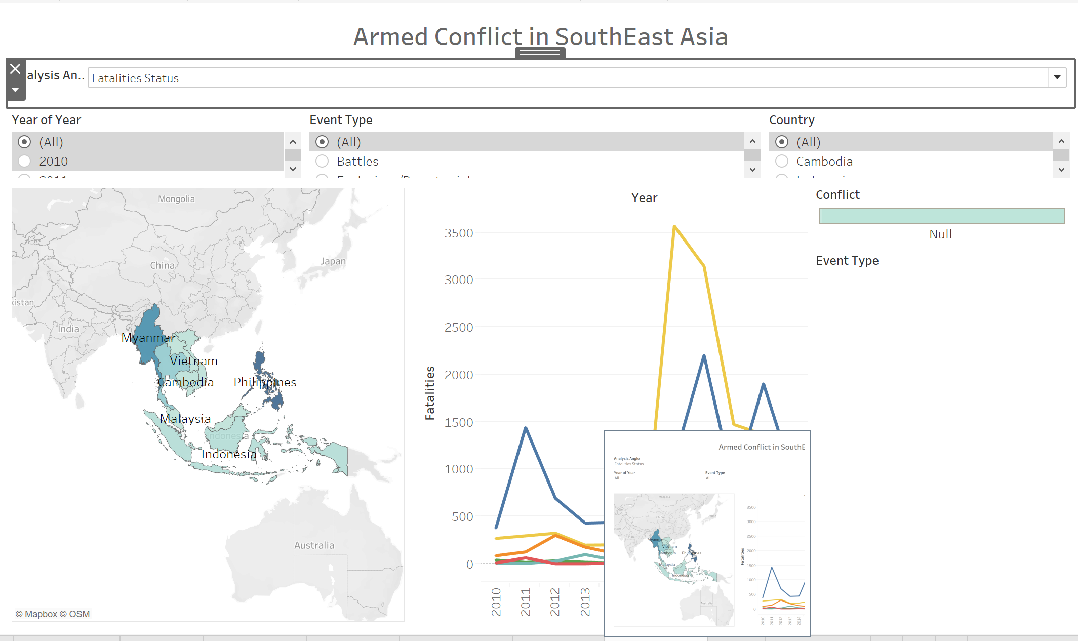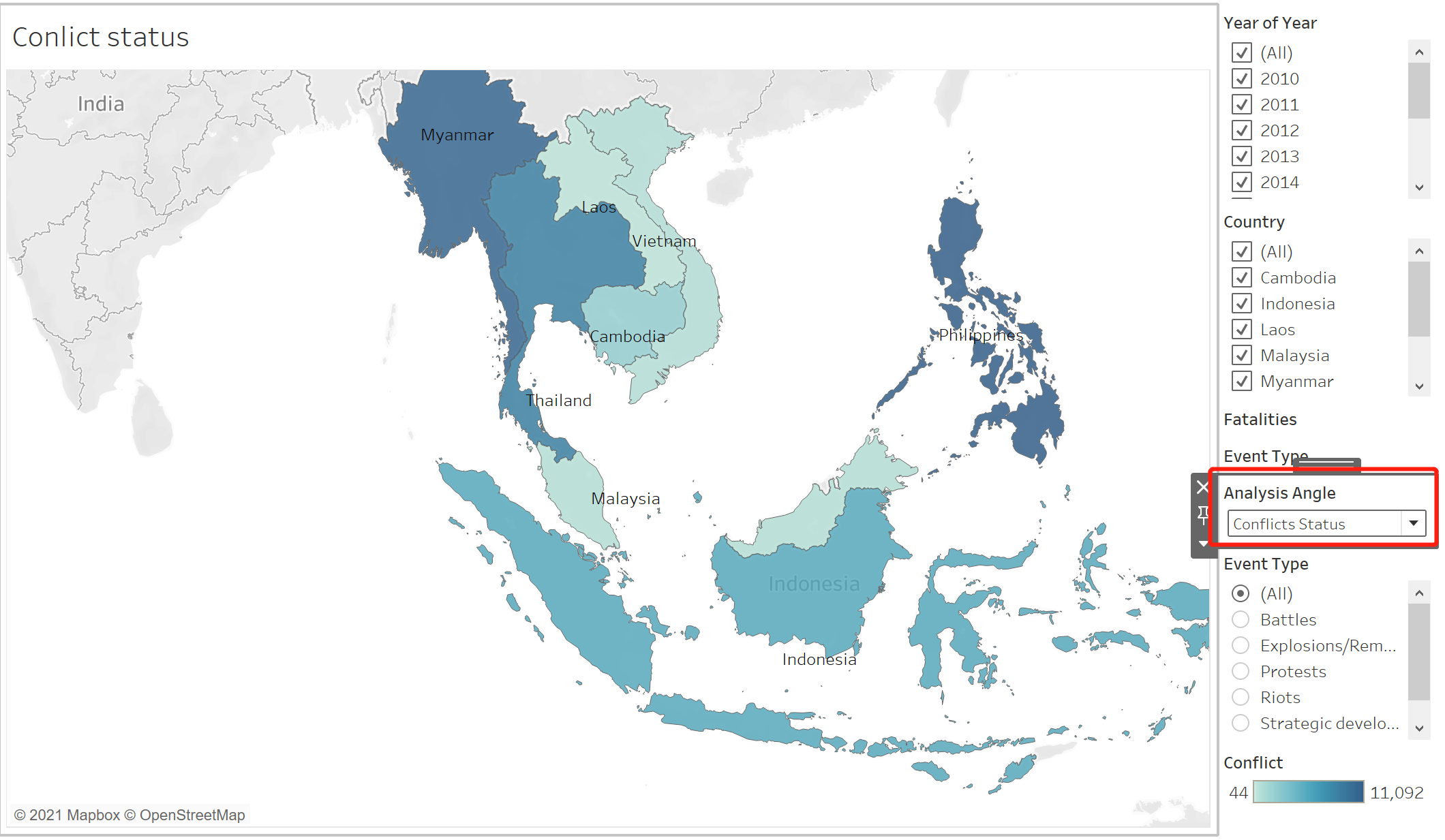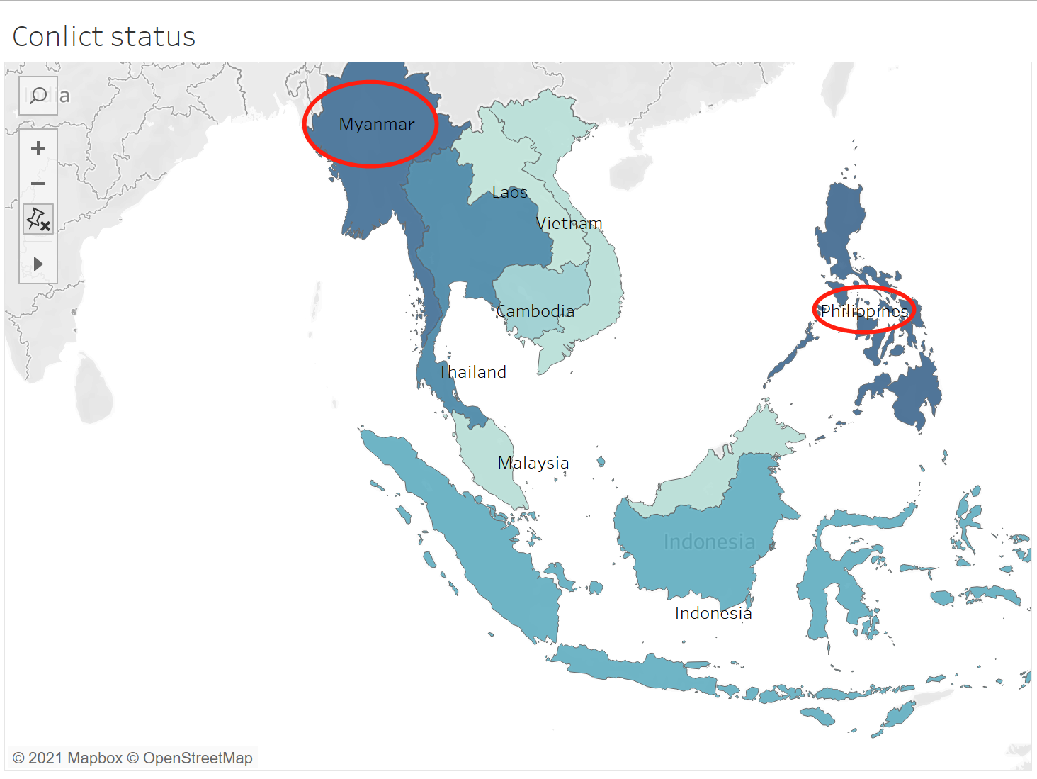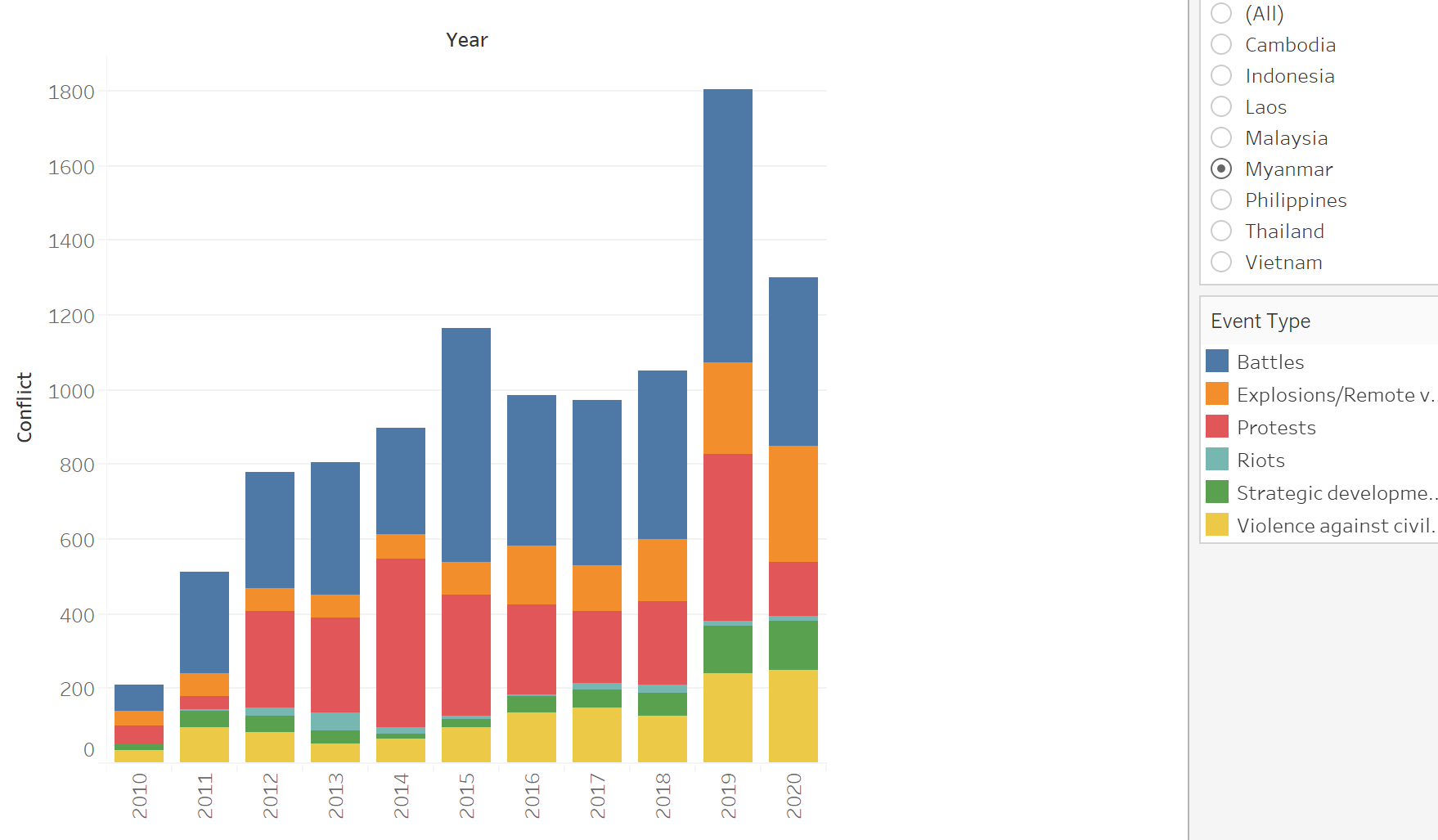 As we can see from the Conflict Status map, Myanmar has the Heaviest color in SouthEast Asia between 2015-2020. Besides, battles account for the largest proportion of them from the bar below.