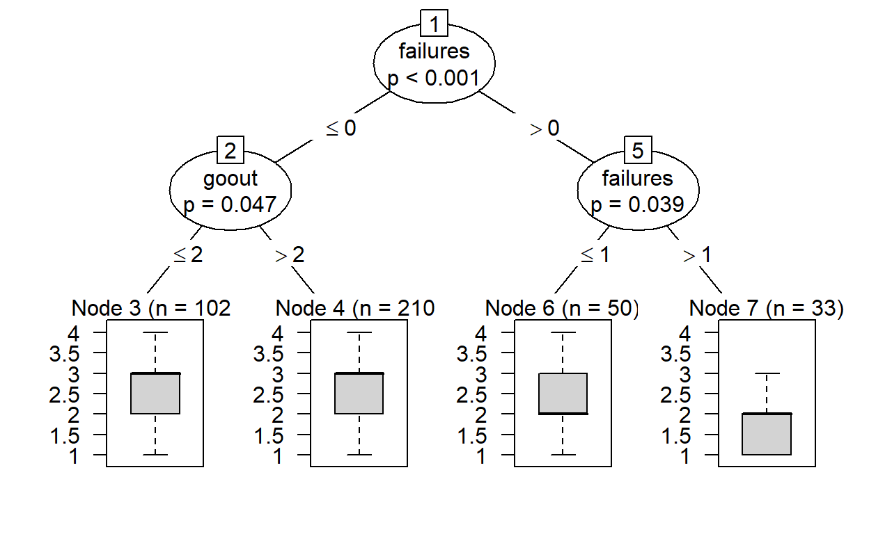 tree <- ctree(Grade~ traveltime + studytime + failures + Walc + goout,